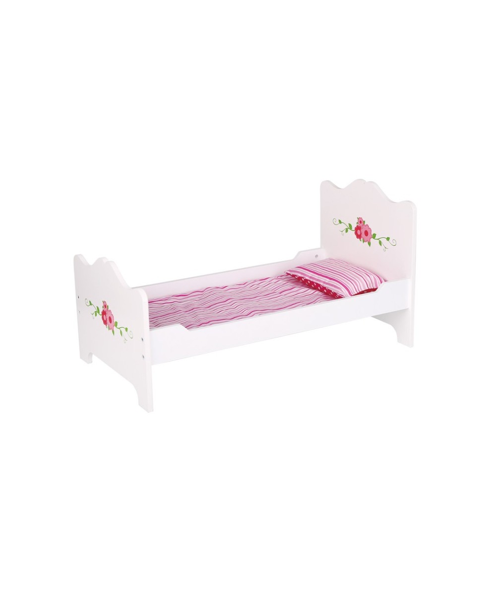 Cama de madera blanca con adornos florales. Colchón y almohada reversibles.