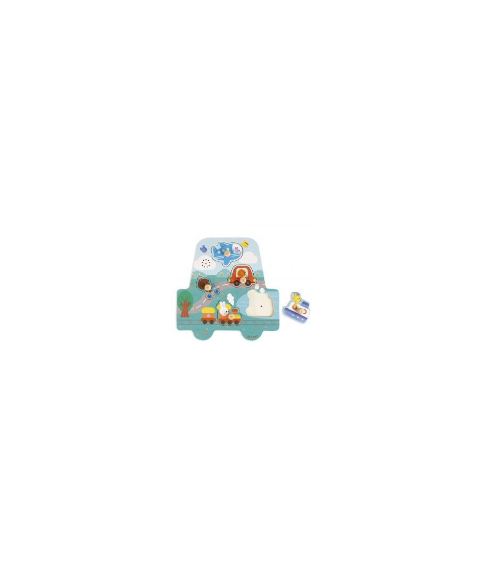 Este robusto encajable de madera está decorado con unas cuidadas ilustraciones que representan los sonidos de los vehículos favoritos de los más pequeños y pequeñas de la casa. Cada imagen es una pieza a encajar, que cuando se coloca correctamente comienza a sonar la melodía, así al bebé le resulta más sencillo y estimulante identificar el lugar correcto. Una gran ayuda para el aprendizaje de los más pequeños, con la que aprenderán a asociar cada forma con su contorno, así como a identificar las imágenes iguales y diferentes, y el sonido que emite cada instrumento. Sus vivos colores llamarán la atención del niño o niña, que practicará el juego independiente mientras desarrolla su capacidad de comprensión causa-efecto y sus habilidades motrices finas.Recomendado a partir de 18 meses.