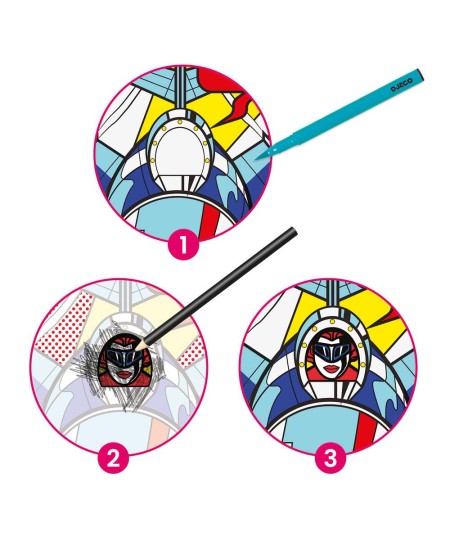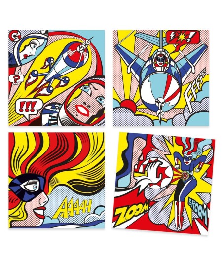Este fabuloso set está inspirado en la obra del artista Roy Lichtenstein y, con él, podrás crear impresionantes obras de arte. Utiliza tus rotuladores para cubrir de colores cada cuadro y, después, hazte con las calcomanías para añadir a la imagen detalles alucinantes.
